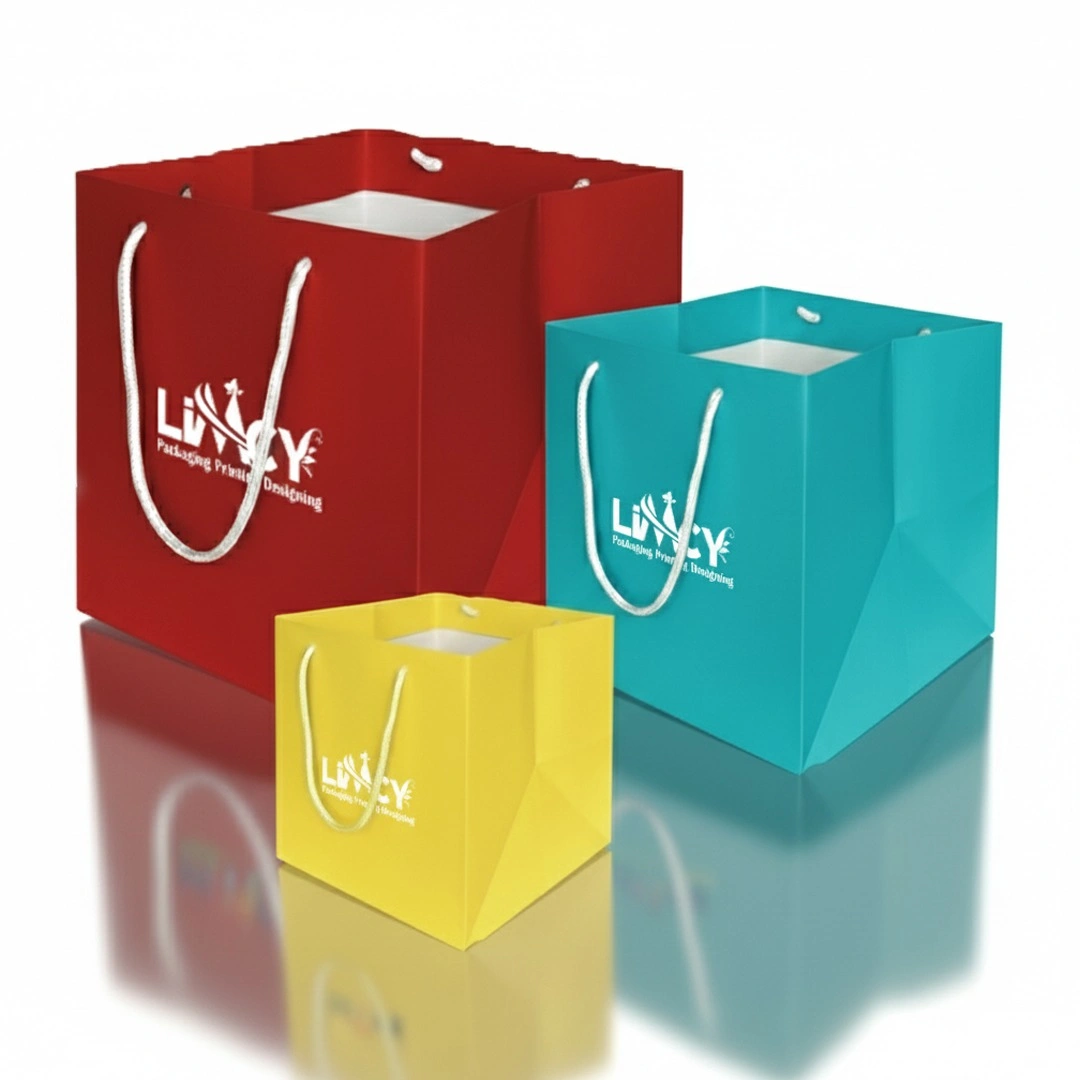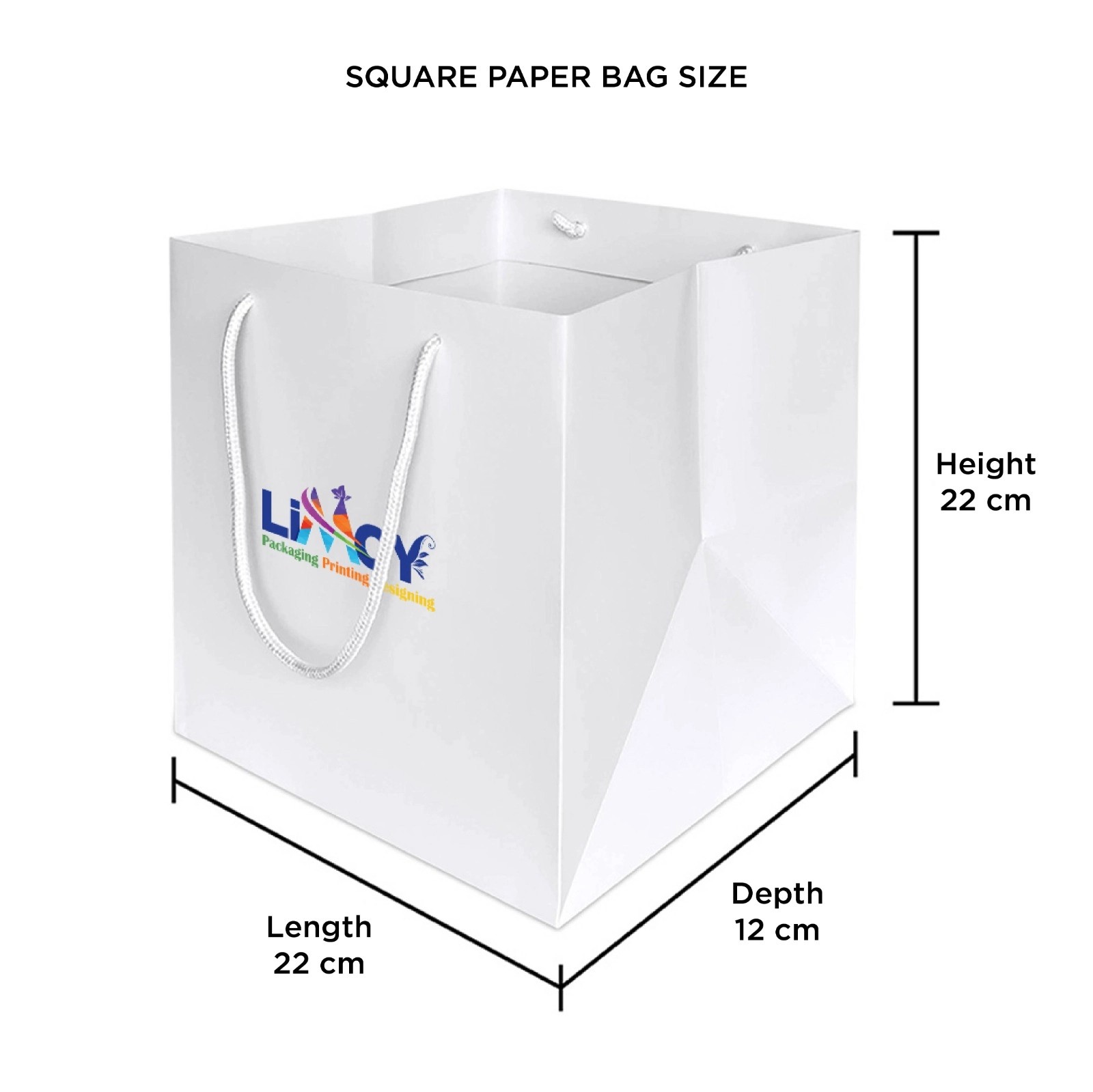We offer custom printed square paper bags with logo or with full color printing at wholesale price. Following specifications, features, and services are available for customization.
